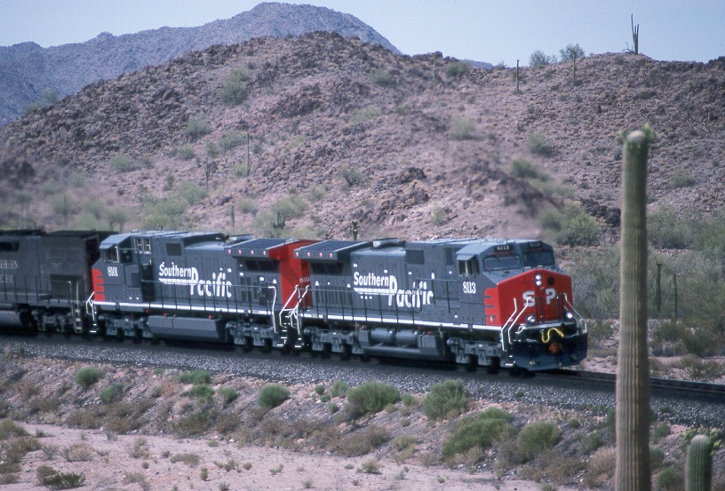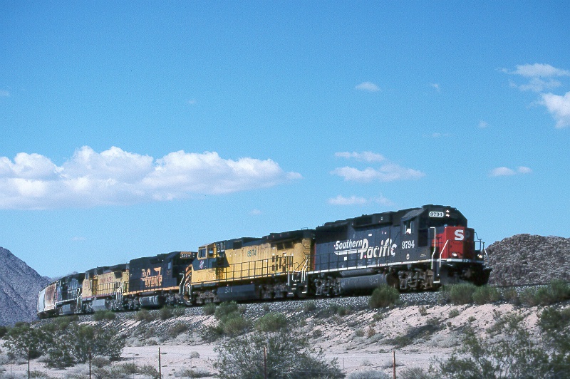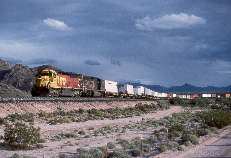 This late afternoon westbound has just left Estrella and is headed downgrade towards Gila Bend. The low light of the afternoon really lights up the forest of cacti! It was well over 100 degrees on this June 18, 1995, but this is the only time of the year that the sun is far enough to the north to make this photo possible. |