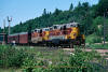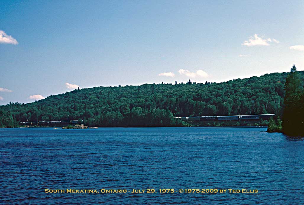 Passenger Extra South at Goulais, Ontario July 10, 1974. These were "Canyon Turns" - i.e., a passenger extra operated from Sault Ste Marie to Canyon and return to the Soo. It was in the early '70's that the Canyon Tour Train really started to gain popularity, and there were times when the regular passenger trains (1 & 2) just could not handle any more cars safely, one issue in particular were the old baggage cars on the head end - they were getting old and tired (like me!) and there were concerns about drawbar and center sill strength. Recall that No. 1 and 2 also made all sorts of stops at just about any milepost along the line, and starting and stopping such a long train was becoming a real pain! This lead to the creation of Trains No. 3 & 4, a summer season only 7 day a week "Canyon Turn" a couple of years later. Click here and here for a copy of one of the train orders necessary to run this train, copied and made complete by yours truly at 341 am just a few days before this photo was taken.. :) . |