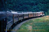 By 1970 the Agawa Canyon Tour was becoming very well known and the passenger count went way up. Here you can see a couple of the 'new' ex-Canadian Pacific coaches behind 2 of the 'Jesse James' cars as the train snakes through the bush country north of the Soo. August 1970. |