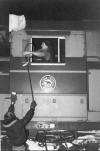Train No. 9's headend brakeman Dave Sneddon has his arm extended just right to catch the orders from operator Mark Mazzenello at Frater .. June 10, 1979. |