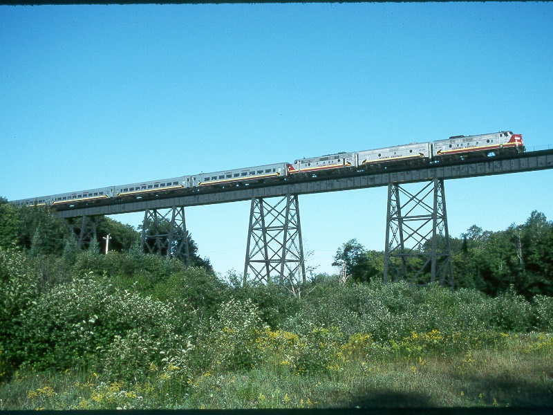 Agawa Canyon Tour) with a A-B-A set of F units. Shown at Bellevue on Aug. 19, 1998. Photo